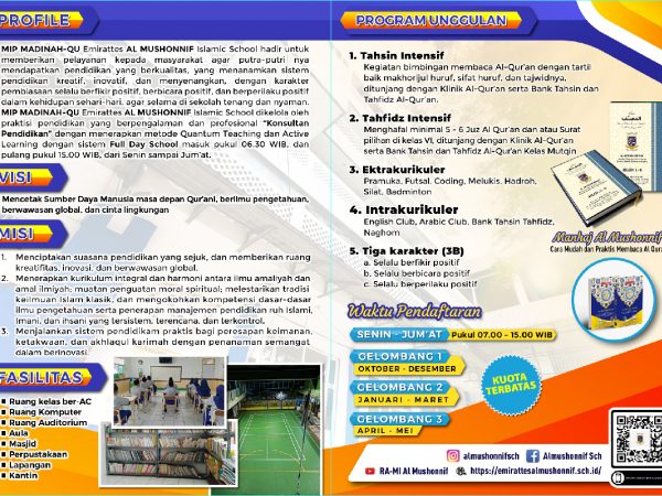 Madrasah Ibtidaiyah Plus Madinah-Qu Al Mushonnif Islamic School adalah lembaga pendidikan Islam yang fokus pada pembentukan generasi penghafal Al-Qur’an. Sekolah ini berkomitmen memadukan kurikulum pendidikan dasar (MI) dengan program unggulan Tahfidz dan Tahzin, menciptakan lingkungan belajar yang islami, berprestasi, dan berakhlak mulia. Visi dan Keunggulan Sekolah ini dikenal sebagai “Madrasahnya Para Penghafal Al-Qur’an,” menjadikannya pilihan ideal bagi orang tua yang...